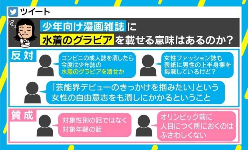 しかし、続いて議論に上っているのが、漫画などを掲載する少年誌。「少年向けの漫画雑誌に水着のグラビアを載せる意味は?」「ふさわしくない」と疑問をつぶやく人が出てきている。これに対し、「成人向け雑誌の次は少年誌か」「過剰反応過ぎる」といった反論が相次いだ。