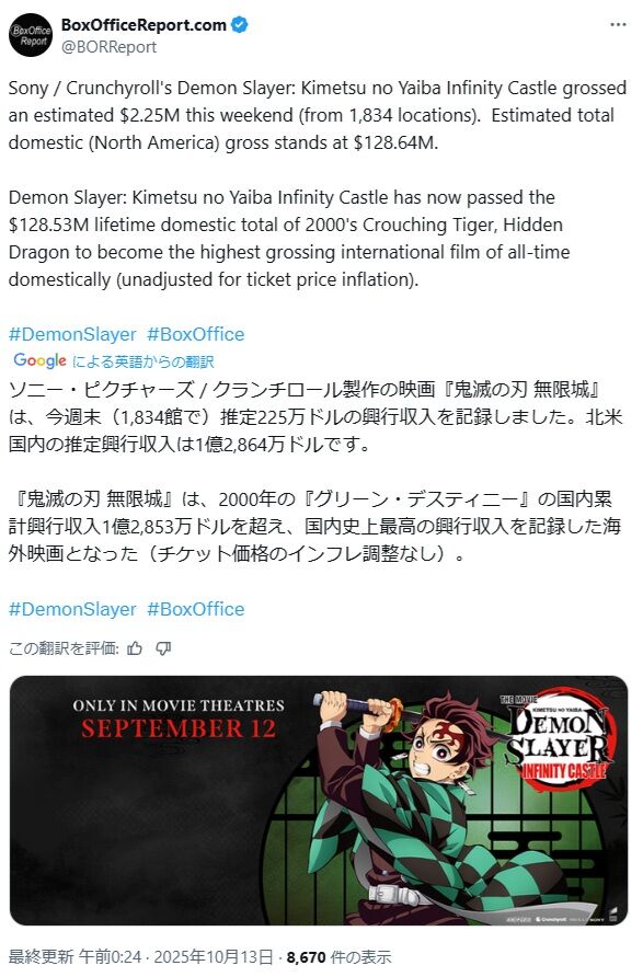 Demon Slayer: Kimetsu no Yaiba Infinity Castle has now passed the $128.53M… pic.twitter.com/32cp6lH0Nw