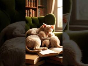 A realistic Cornish Rex cat cuddling with kittens in a library with sunlight #cat #kitty #meow