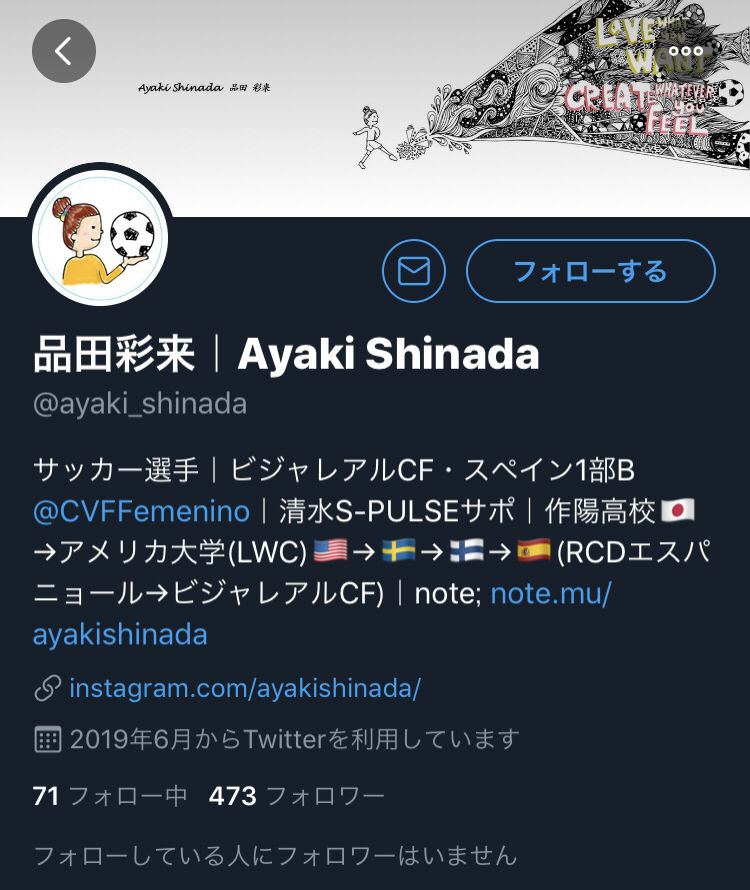 2019年8月16日サッカー選手をしている品田彩来です。ツイッター始めます✍️💭今年からスペイン1部BのビジャレアルCF所属になりました。日本語主体で呟きます。よろしくお願いします!#初めてのツイート #ビジャレアル #女子サッカー #ayakishinada #品田彩来 pic.twitter.com/XFcHY5tfNY