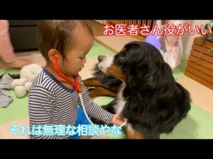 【犬と子供】お医者さんごっこに参加する バーニーズマウンテンドッグ bernese mountain dog