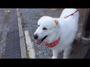 シャンプーへ行きヒマワリのリボンを付けてもらったルンルンです Great Pyrenees グレートピレニーズ