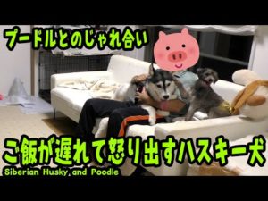 ご飯が遅れて怒り出すハスキー犬 プードルとのじゃれ合い Husky Puppy and Poodle