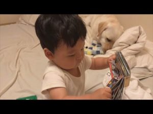 犬のぬいぐるみと絵本で戯れるバウと赤ちゃん【ラブラドールと赤ちゃん11ヶ月】Labrador & Baby