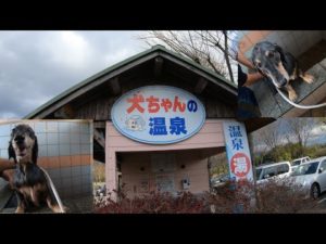 犬の温泉に入るラブラドールとミニチュアダックスのミックス犬くう