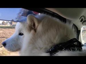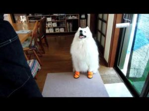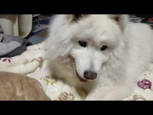 大好きなおやつ入りボールを夢中で取り出しているサモエドのレン