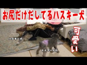 こたつからお尻だけだしてるハスキー犬と入れないトイプードルが可愛い