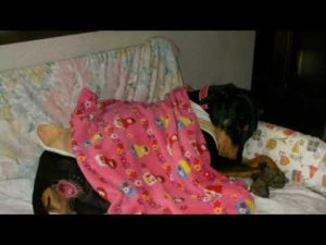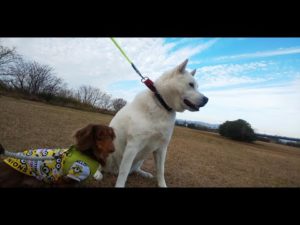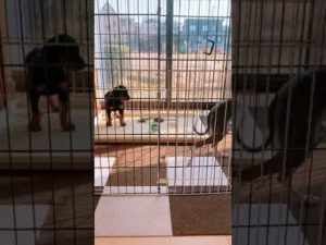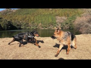 しつこくある遊びに誘うドーベルマンのロックと、声が高いシェパードのケイリー
