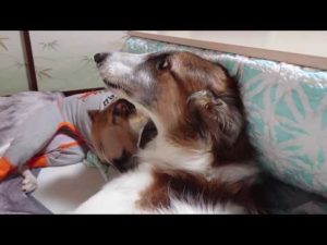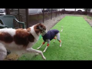 ボルゾイのマーフィーとイチャイチャするウィペットのフィリッパ。