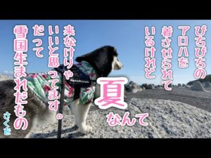 夏を先取り♪アロハシャツで海岸をお散歩するアラスカンマラミュート【桜空】