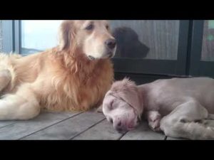 【ワイマラナーとゴールデン】ちびワイマ、父さんゴールデンに見守られて爆睡
