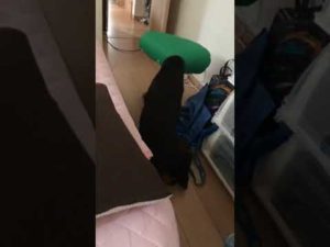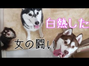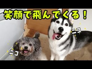 冷蔵庫を開けると笑顔で飛んでくる犬達 ハスキー犬とトイプードル