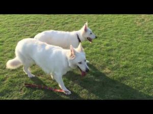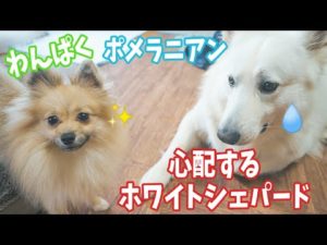 インコと初めて会ったポメラニアンと心配するホワイトシェパード