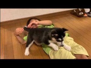こどもとじゃれるシベリアンハスキーの赤ちゃん(生後1ヶ月27日目)Baby's Siberian Husky Playing with Children