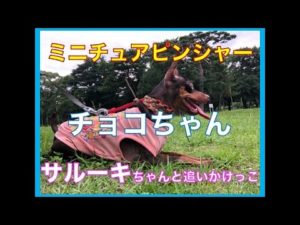ミニチュアピンシャー チョコちゃん サルーキちゃんと追いかけっこ