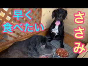 蒸しササミ 食べます😋🍴💕 超大型犬 ニューファンドランド ボス君 優しい巨人 グレートデン クィーンちゃん 犬用 ささみ おやつ フードスタンド Dog