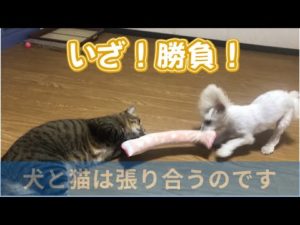 犬と猫はこんなに張り合うものなのです。マルチーズのちゅーぶ君の場合