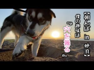 【朝んぽ】久しぶりの砂浜で穴を掘り続けるアラスカンマラミュート