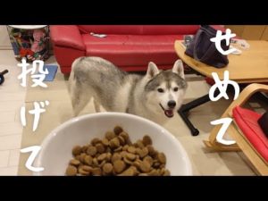 一粒ずつ投げて貰わないとカリカリごはんを食べようとしない甘ったれシベリアンハスキー