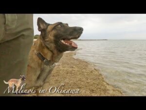 【運動後、クールダウンする犬 】干潮でビーチから遠い海で浸かる犬