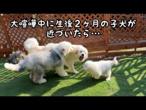 【神業】大喧嘩してるところに生後2ヶ月の子犬が近づいたら超大型犬が秒でかわしてくれました|グレートピレニーズ&オールドイングリッシュシープドッグ&トイプードル