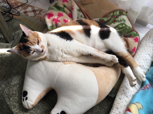 はみでる柴犬を真似した三毛猫の謎の姿