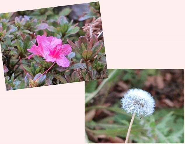 季節外れに咲いてしまった、つつじとタンポポの綿毛。