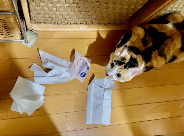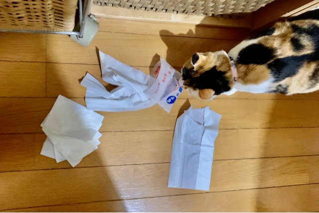 ポケットティッシュを解剖して遊ぶ猫の表情