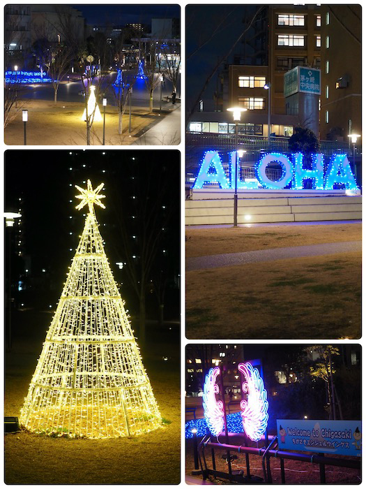 「茅ヶ崎市役所前の広場でイルミネーションをやっているよ」