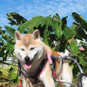 夕方の散歩に行くため、 車椅子の装着を待っているあん。 歩き始める…