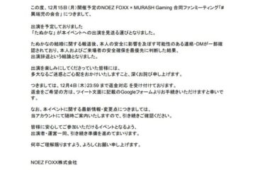 たぬかなさん、身の安全が確保されない為にイベント出演自粛へ