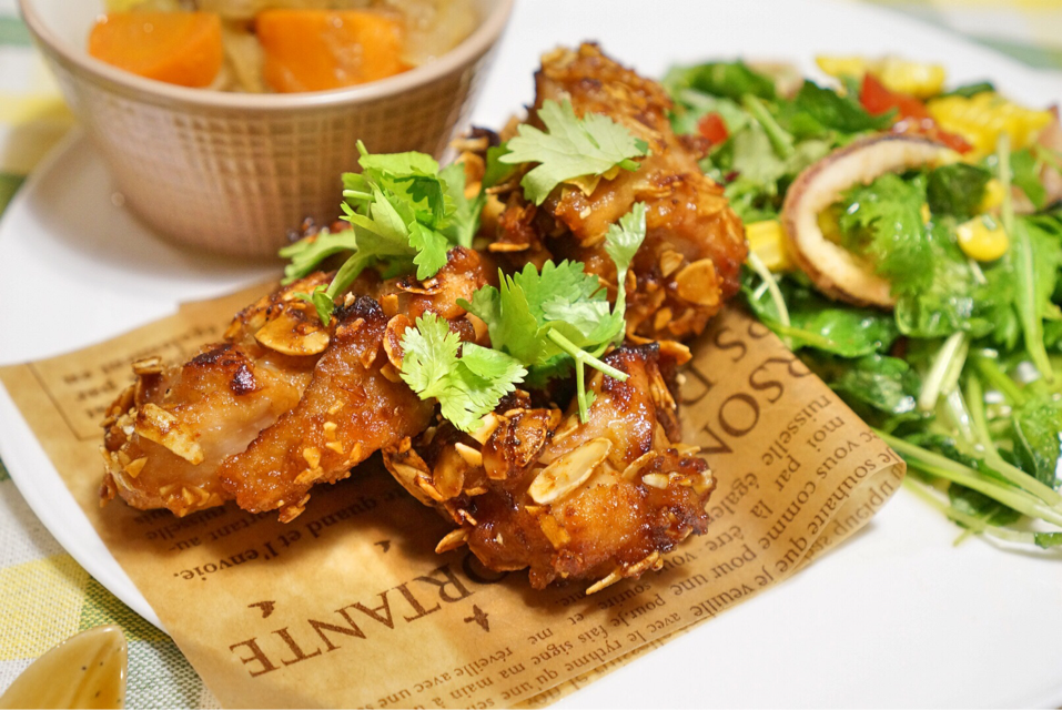 材料「鶏肉、醤油、ごま油、酒、生姜、にんにく、片栗粉、揚げ油・・・」