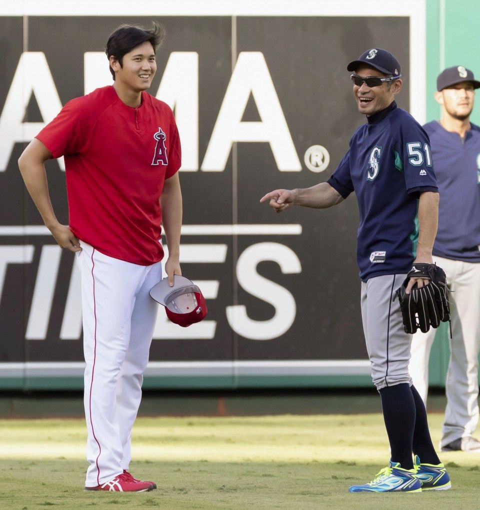 エンゼルス・大谷は試合前練習ではマリナーズのイチロー会長付特別補佐の元へあいさつに出向き、談笑した。