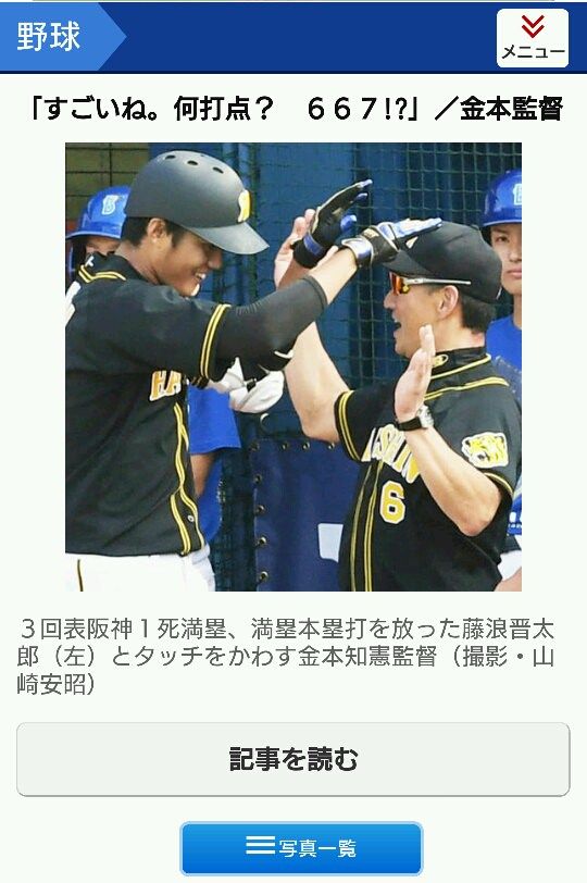満塁ホームランを打った藤浪さん、金本監督の頭を撫でる