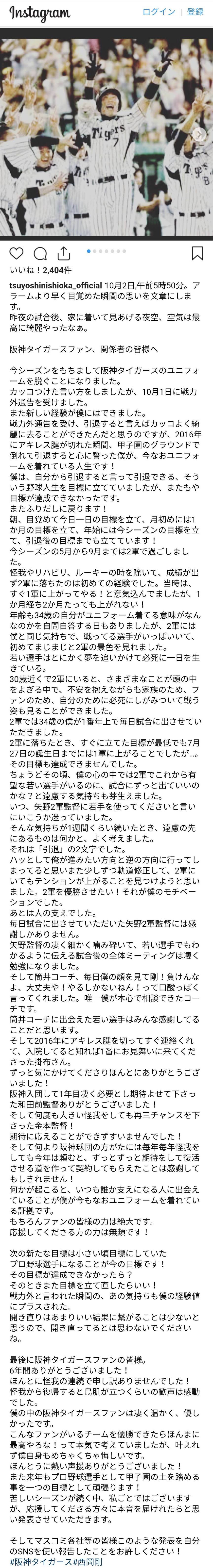 西岡剛さんがインスタに投稿した引退発表文