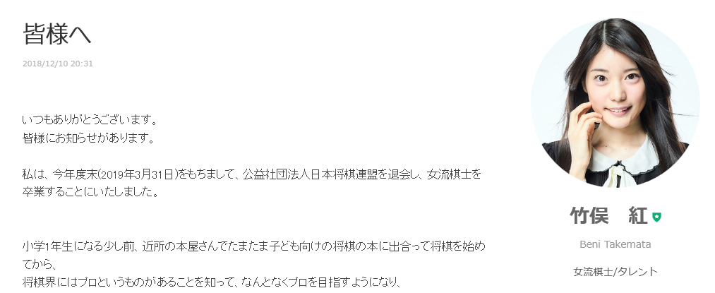 私は、今年度末(2019年3月31日)をもちまして、公益社団法人日本将棋連盟を退会し、女流棋士を卒業することにいたしました。