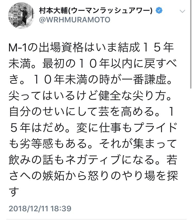 ウーマン村本さん「M-1の出場資格を結成10年以内に戻すべき」