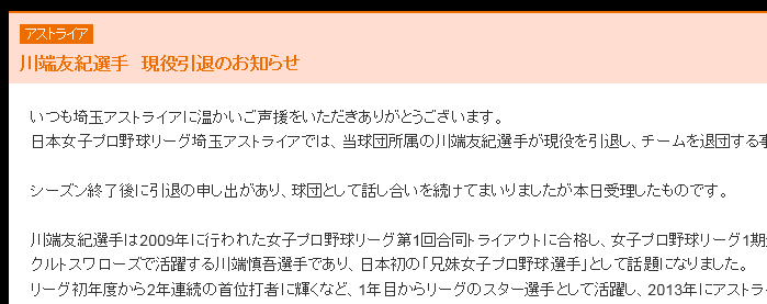 【女子プロ野球】埼玉アストライア川端友紀が引退【兄は慎吾】