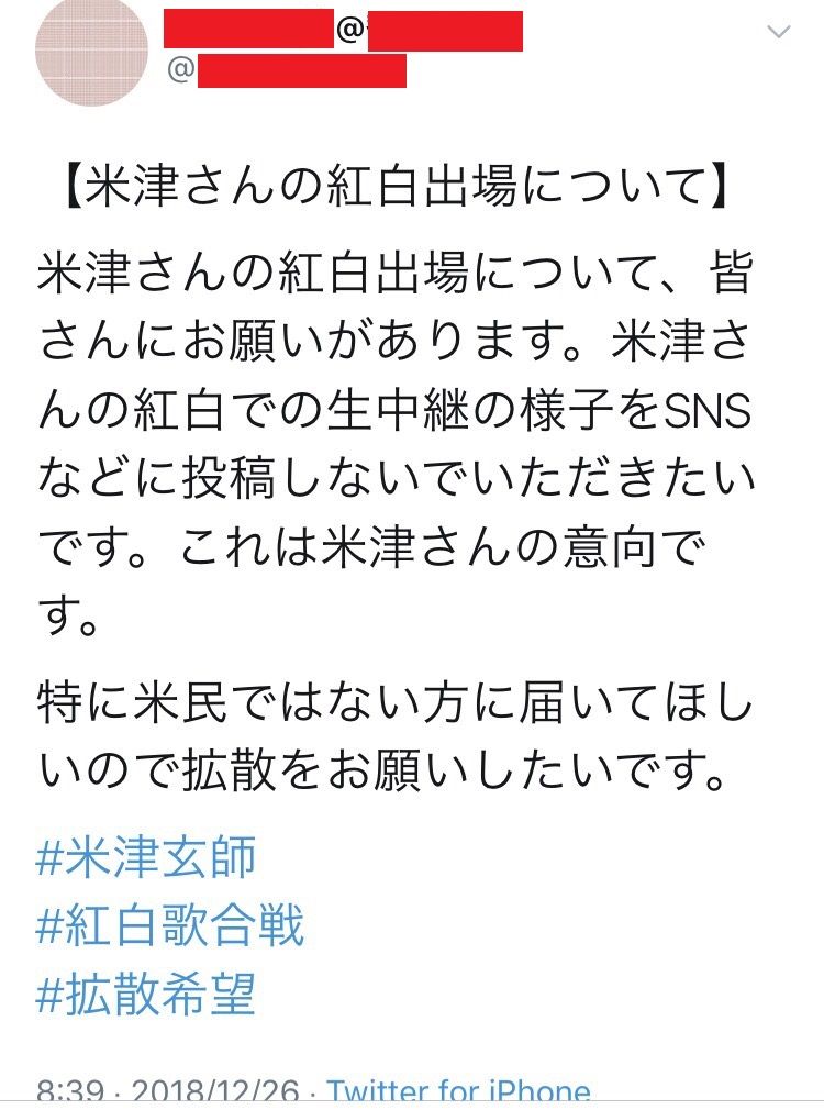 米津玄師のファン「紅白の画像はSNSに絶対上げないようにお願いします!米津さん本人の意思です!」