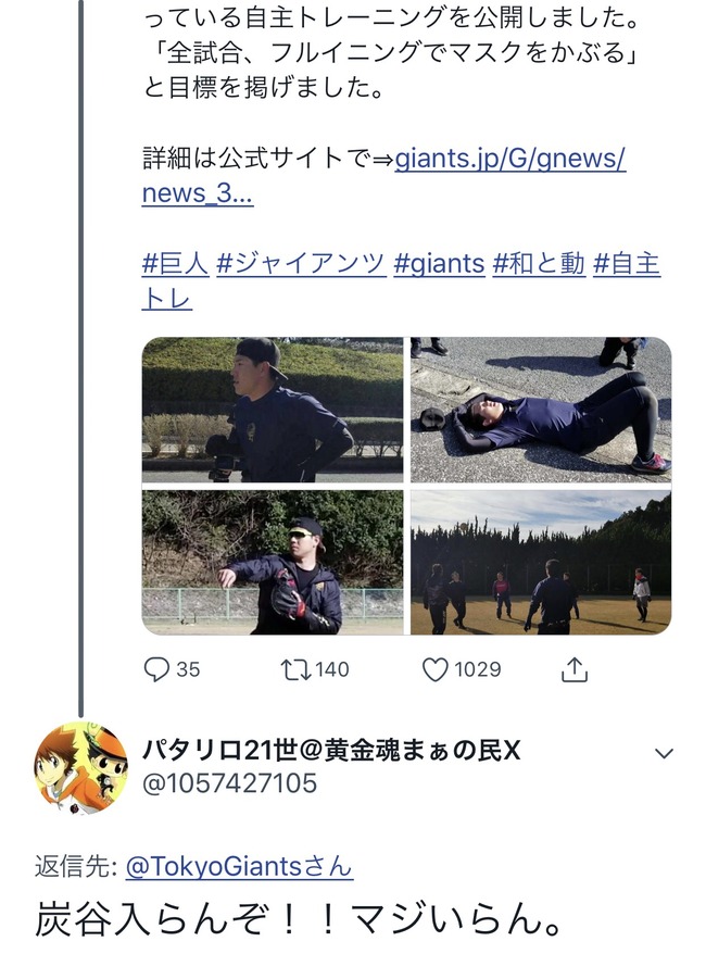 【悲報】巨人の公式ツイッターが炭谷の自主トレを呟いた結果wwwww