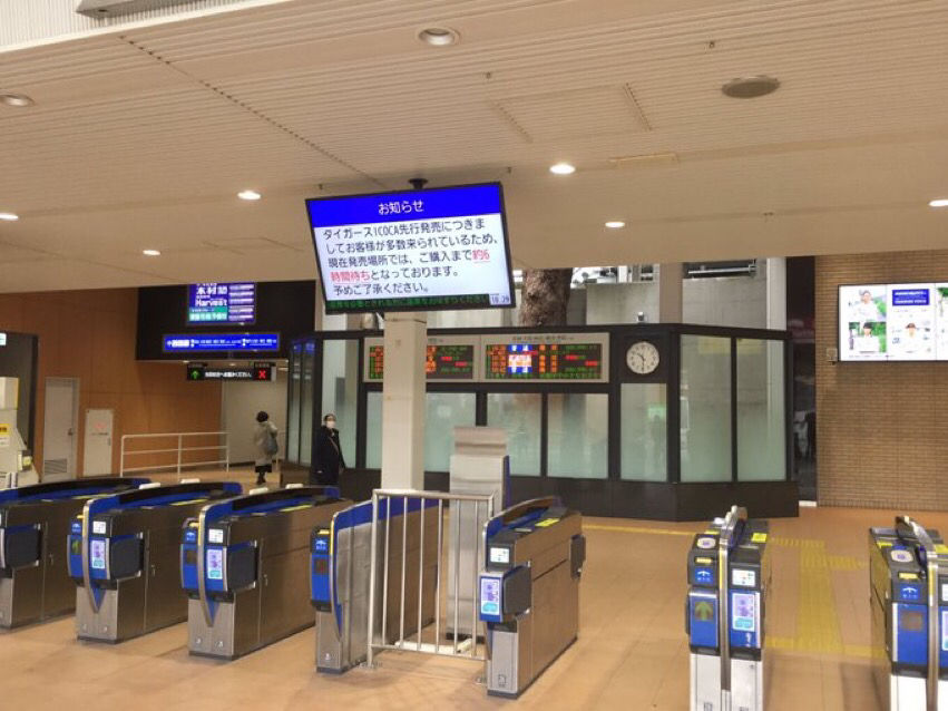 甲子園駅での『タイガースICOCA先行発売』につきまして、お客様に多数お越しいただいており、現在、ご購入まで約6時間待ちとなっております。