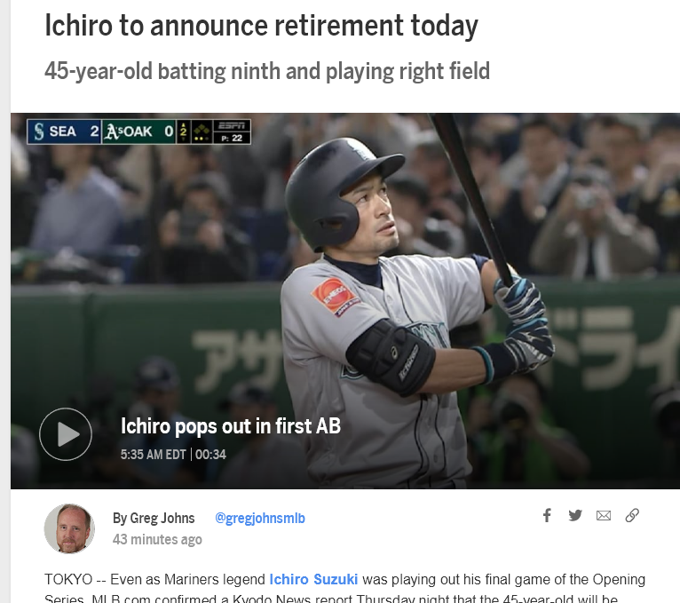 MLBの公式サイトは「Ichiro to announce retirement today」(イチローが今日引退発表へ)との見出しで伝えた。