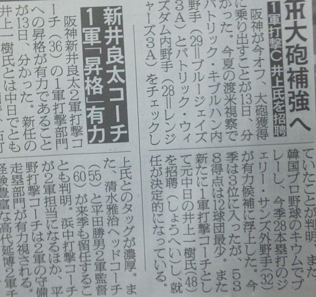 阪神大砲補強へ&新井良太コーチ1軍昇格有力