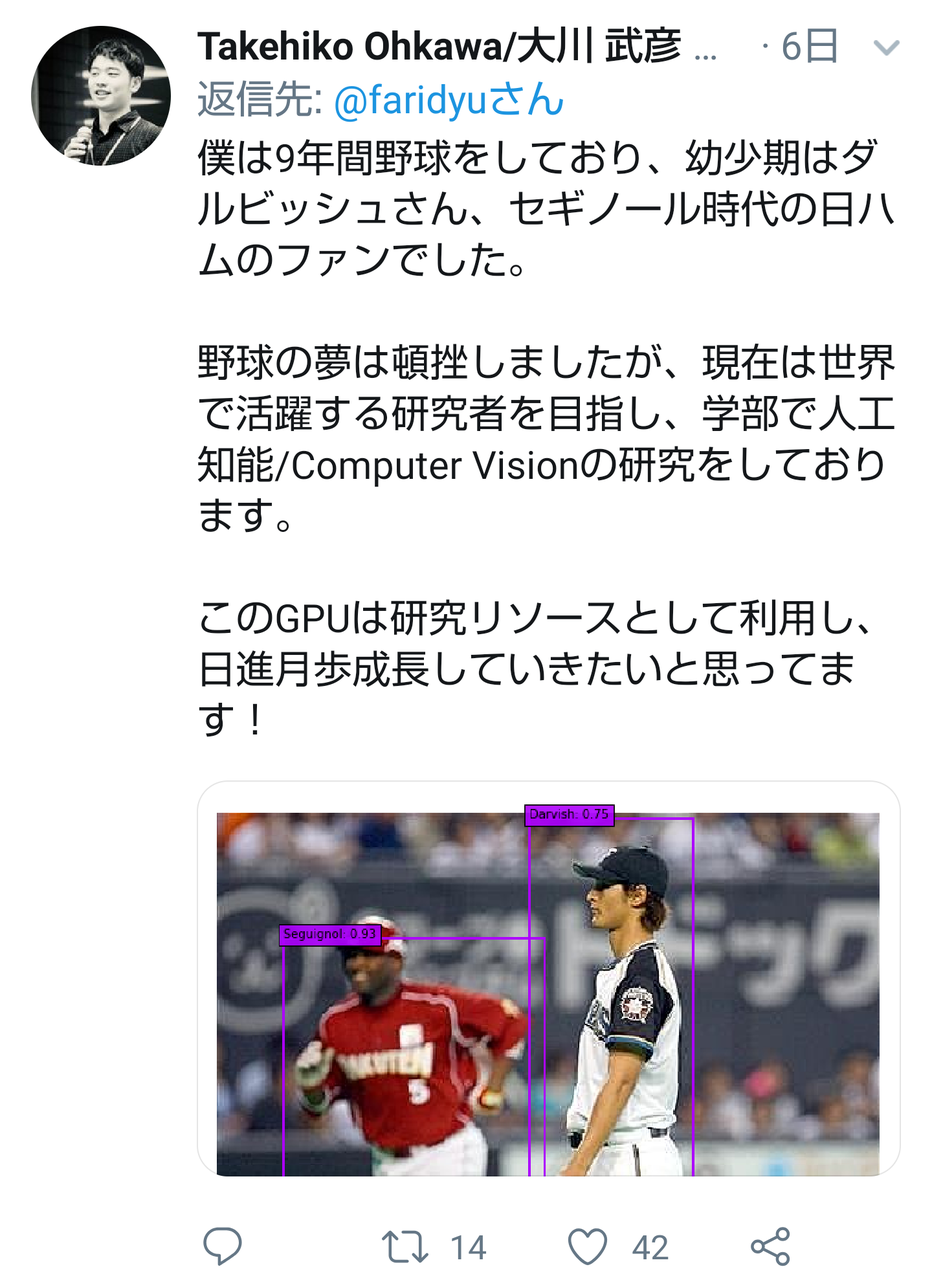 ダルビッシュファンの元球児でAI研究者志望の学生がAI開発に使いたいと応募