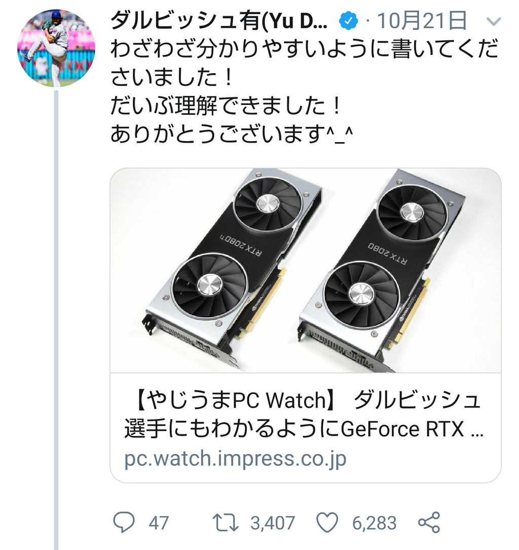それを見ていたPC Watchがダルビッシュのために専門用語を使わない一般向けのRTX2080Ti解説記事を書く