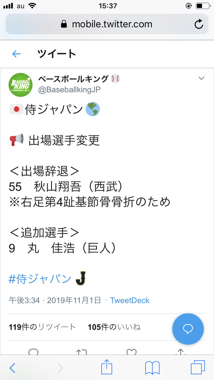 西武・秋山 骨折だった 昨日右足に死球【侍ジャパン強化試合】