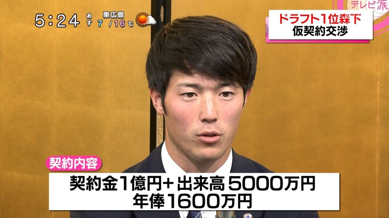 広島ドラフト1位森下、契約金1億円+出来高5000万、年俸1600万