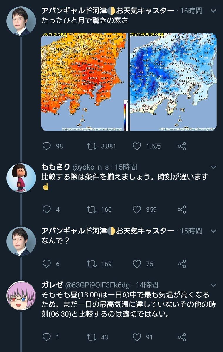 お天気キャスター「たったひと月で驚きの寒さ」 →「同じ時間で比べろよ」→キャスター「なんで?」