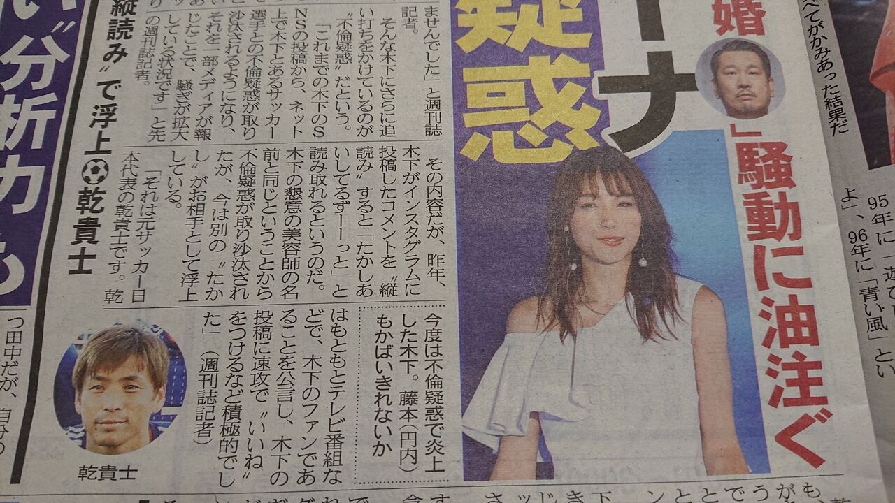 【悲報】木下優樹菜と乾貴士の不倫疑惑、新聞に載る