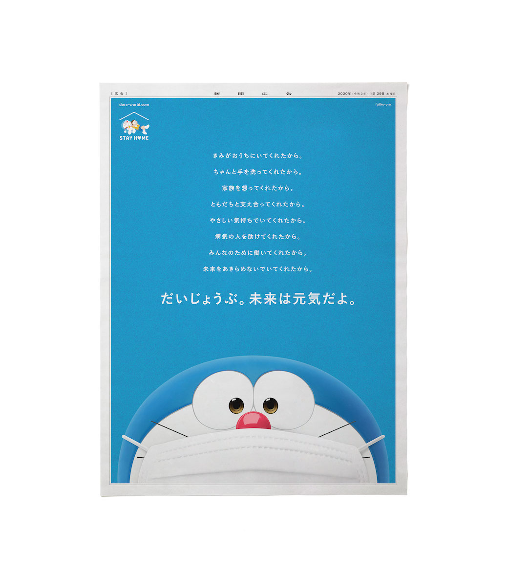 【STAY HOMEプロジェクト】お出かけできない連休だけど、おうちですごす時間もたのしいよ!ドラえもんからのメッセージを本日4月29日の朝日新聞朝刊に掲載しました!!ドラえもんからのメッセージが入ったかべがみもダウンロードできます!!
